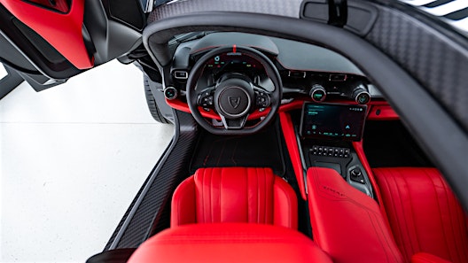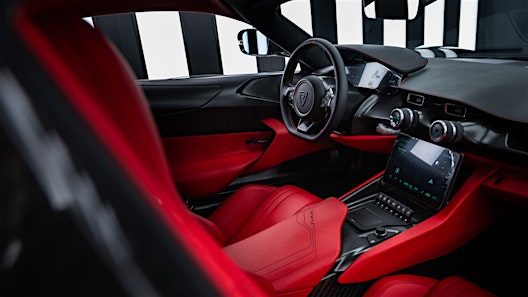 After much deliberation, Branko opted for an aggressive configuration that would match the Nevera’s hypercar personality; a deep Predator Black ‘Fantasy’ finish – with Red Blaze leather interior. The exterior is highlighted by gloss red brake calipers, hidden behind Infinitus-style wheels – and a number of bespoke touches in the interior, including black satin finish for the anodized metals, perforated seats and signature Rimac stitching.