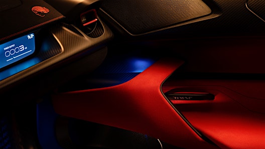 Inside Nevera’s cabin, bespoke motifs can be hand-stitched into armrests, headrests, knee cushions and more. Special messages can be laser-etched into a metal plate mounted on the bulkhead, and colors and materials are almost endless in their availability. The timeless elegance of a full Napa leather interior, the subtle modernity of an Alcantara and leather mix or even a full Alcantara interior can be applied in a mixture of colors or simply one, highlighted by vibrant stitching. Metal surfaces of the cabin – the door handles, steering wheel buttons and infotainment controls – can all be anodized in a host of different colors to an extent no other manufacturer offers, all because this complex and delicate process could be tested in-house.