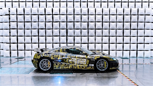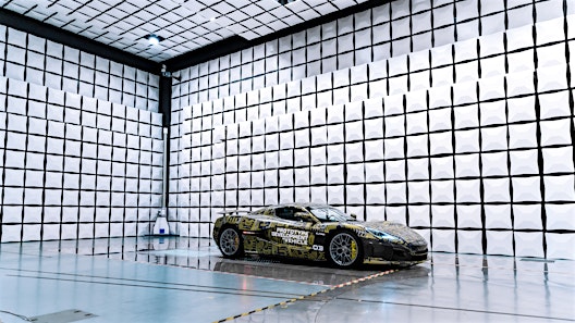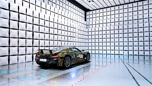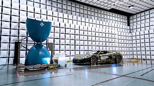 Setting up for the vehicle test, the C_Two is put inside a Semi Anechoic EMC chamber. With hybrid absorbers and ground plane, it is completely sealed off from outside world interference, meaning that the car can be thoroughly tested without the risk of any external electromagnetic radiation seeping into the room and affecting the results.
