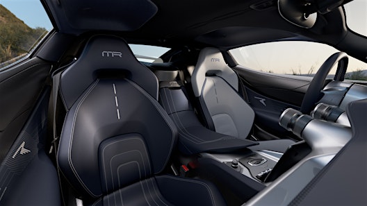 Running along the roof is an ultra-thin central stripe that defies convention – its thinnest part measuring just two millimeters – incorporating Rimac's signature cravat motif and subtle circuit board graphics. Inside, door panels feature bespoke embroidery marking three crucial dates in Rimac's history: the garage era, the launch of Concept_One, and the record-breaking period with Nevera and the Campus. An asymmetrical seat layout pays homage to Mate's own Nevera configuration.